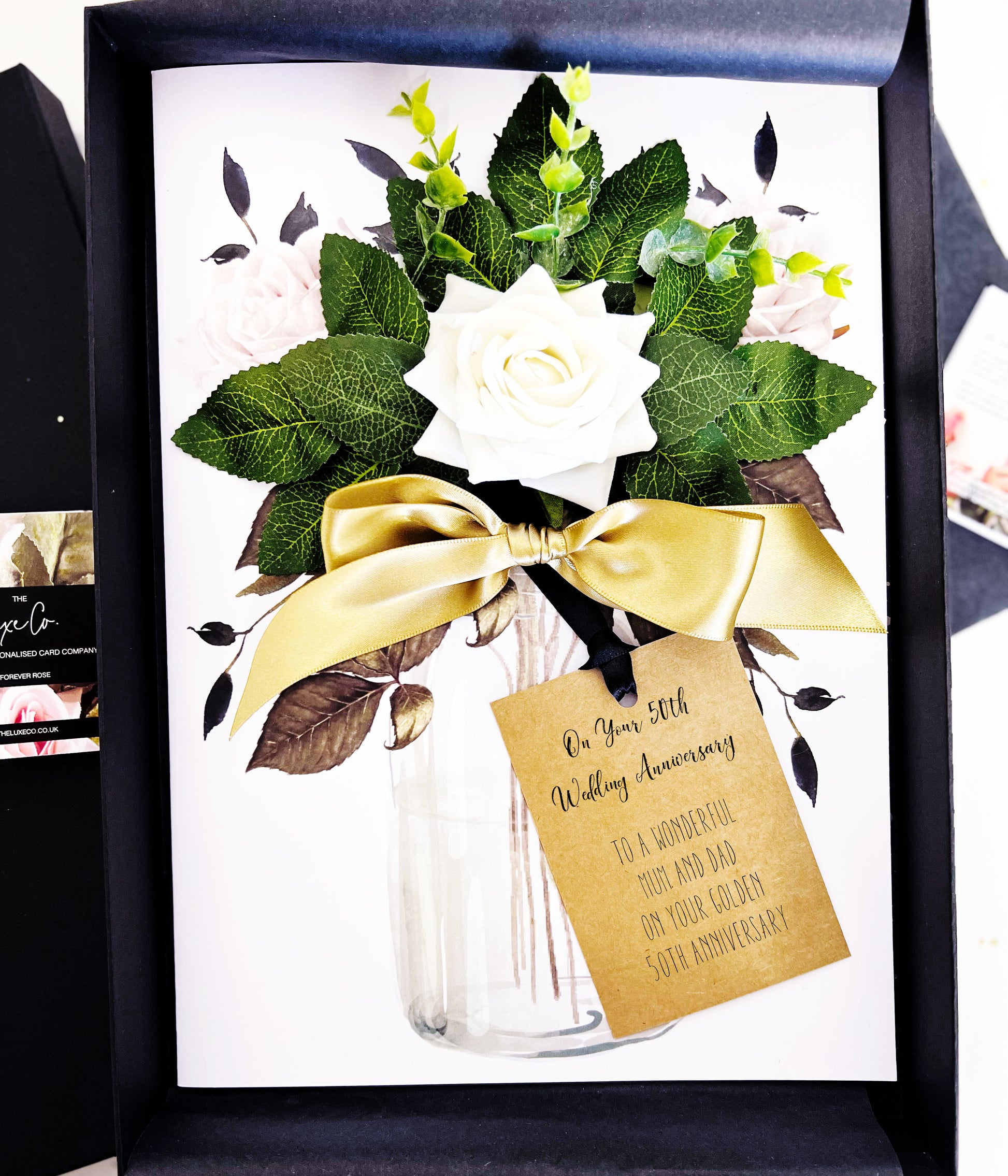 Scented ivory velvet rose with gold ribbon boxed cards for special anniversaries and wedding celebrations for wife, husband, parents.
