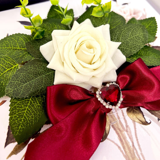 A lot of thought goes into our handmade cards. It's the attention to detail that makes a gift out of opening. Our luxury personalised handmade cards have been designed to be a treat to open. Housed in luxury gift boxes, designed with silky ribbon bow ties to wrap around boxes (pre-tied, for you to slip over the box before giving). We want to make a real treat out of opening one of our cards. Like a gift.