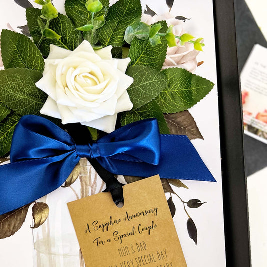 Tarjeta de lujo perfumada del 45.º aniversario hecha a mano con rosa de marfil y satén de zafiro