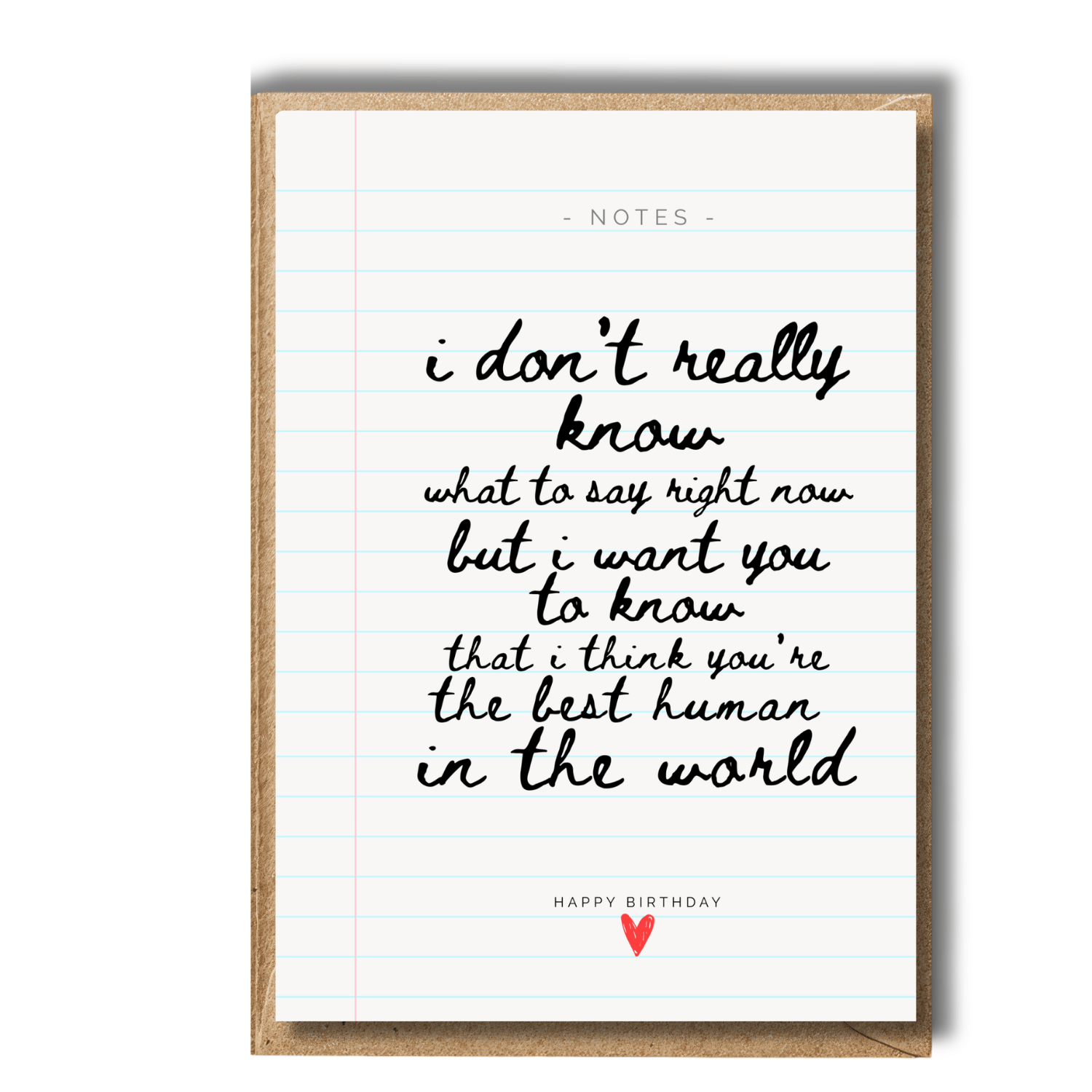 Birthday Card Wording reads 'i don't really know what to say right now but i want you to know that i think you're the best human in the world. Happy Birthday'