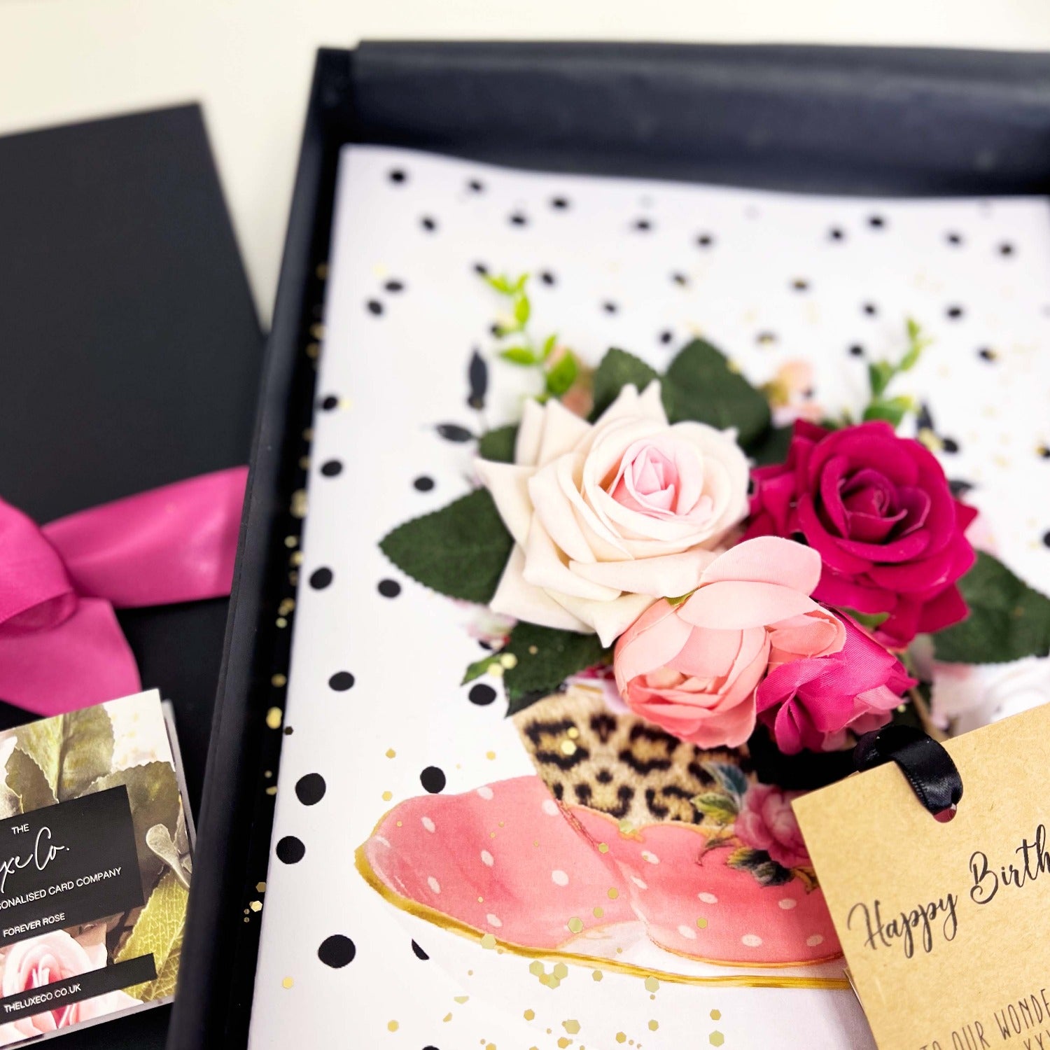 Tarjeta del Día de la Madre en caja con estampado de lunares dulces, estampado de taza de té y ramo floral en 3D y etiqueta. Para las mamás amantes del té o de la ginebra (¡¡quién dijo algo sobre tener té en ellas!!). Una tarjeta especial del día de la madre para mamás verdaderamente especiales. También es una manera maravillosa de sorprender a mamá con una invitación a la merienda o al té de la tarde si ese es tu plan.