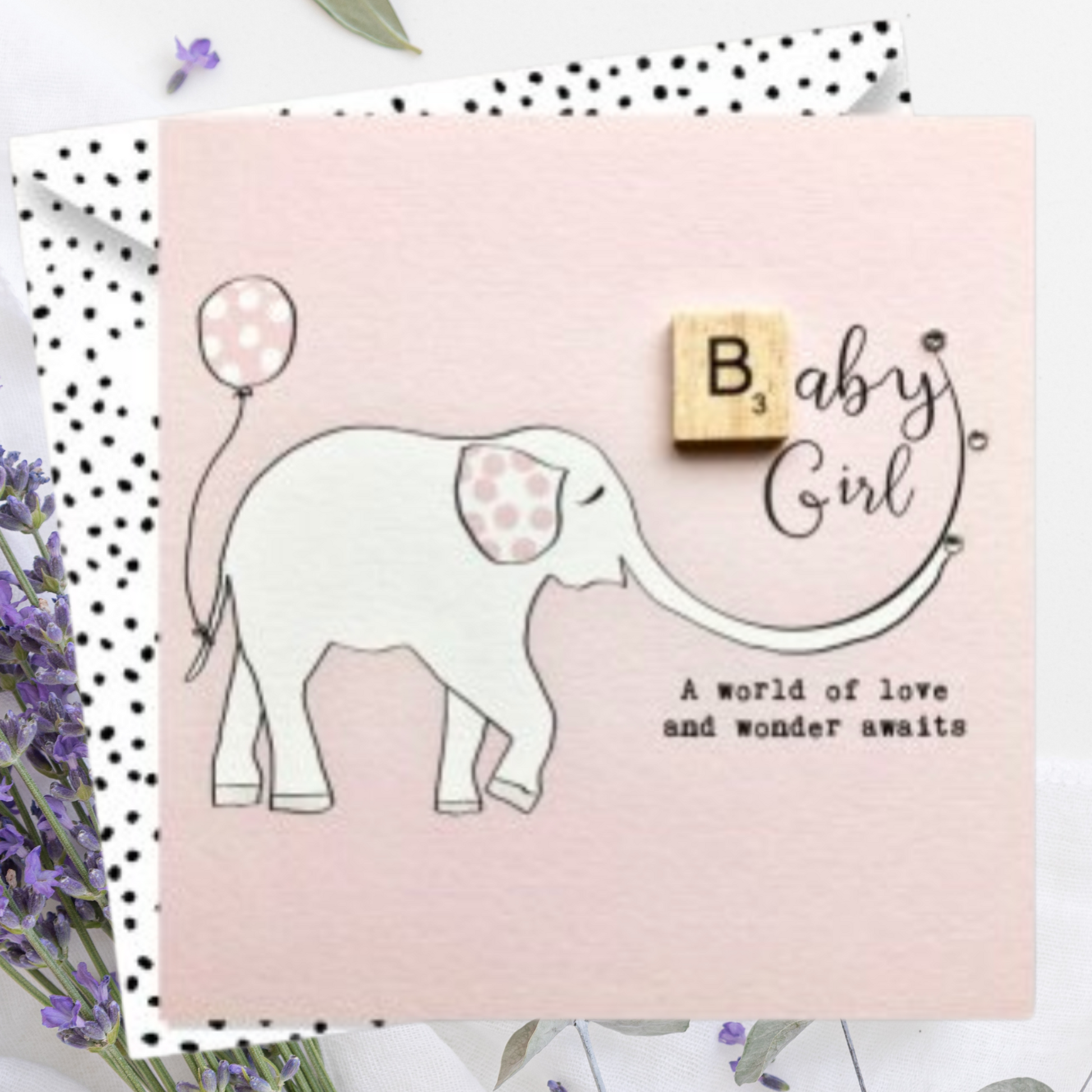 Show someone you care with a Bexy Boo newborn birth card. Celebrating the arrival of a new baby girl just got mega cute with this super sweet card featuring a sweet pastel pink baby elephant print with 3d scrabble decorative piece. Also available in blue grey for baby boy.
