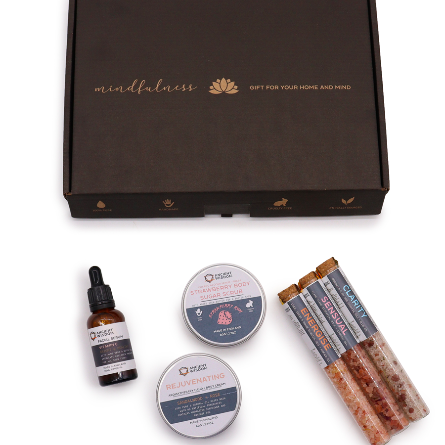 Un set de regalo de atención plena y cuidado personal que contiene 6 productos de cuidado personal para vivir una vida más consciente y saludable. Cada caja incluye: vigorizante exfoliante corporal con azúcar y café | Crema para manos y cuerpo con salvia y lavanda | Viales de poción de sal de baño Detox, Relax + Skin Revive | Suero facial con ácido hialurónico