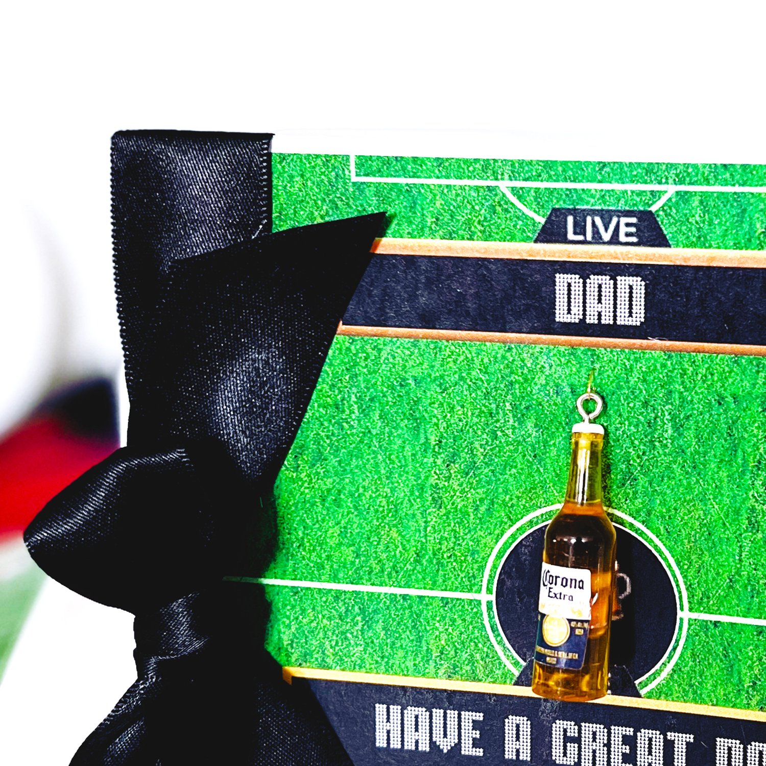 Cada tarjeta de cerveza está impresa con un campo de fútbol, hecha a mano con un dije de cerveza y rematada con un lazo de satén en el color del cumpleañero.