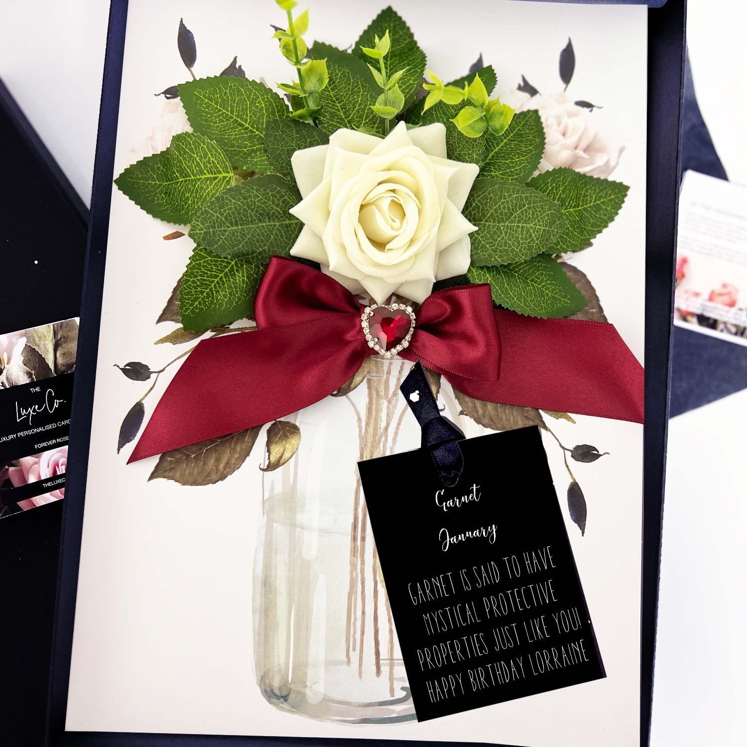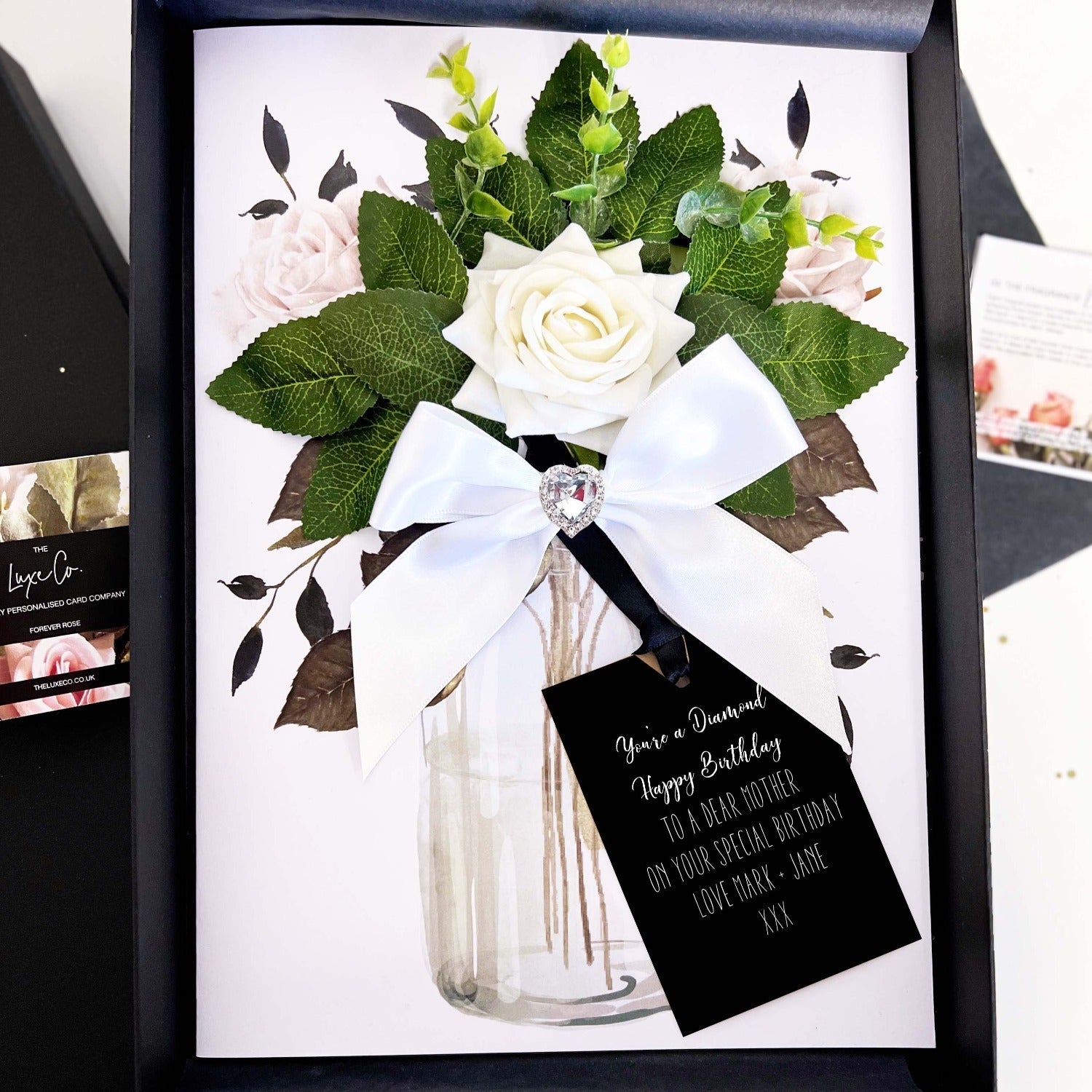 This luxury personalised card comes housed in tissue lined luxury gift box to make an art of card giving. You see our cards are more like gifts and we wanted to showcase this with their own beautiful gift box. No envelopes here.