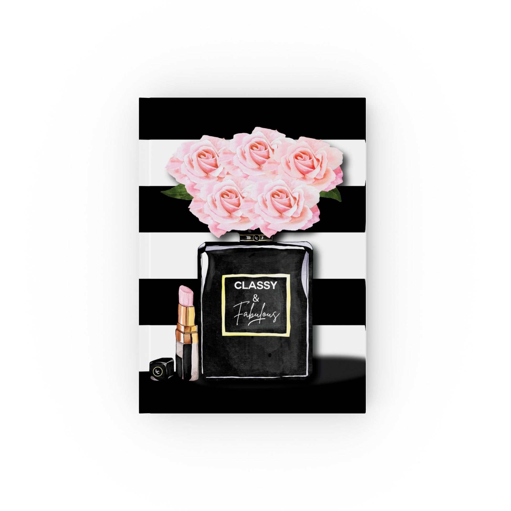Black & White Stripe Journal Notebook with Blush Pink Roses in Perfume Bottle Design