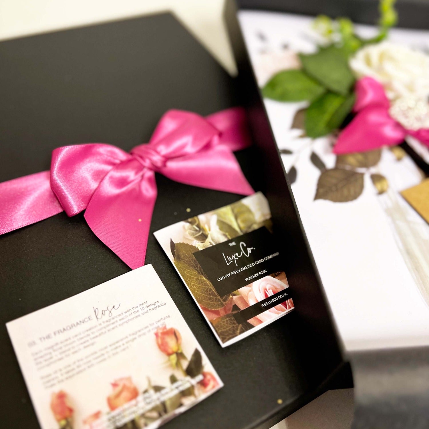 Comes with a tissue lined luxury gift box instead of an envelope and satin hand tied ribbon box bow to slot over the box and delight the receiver.