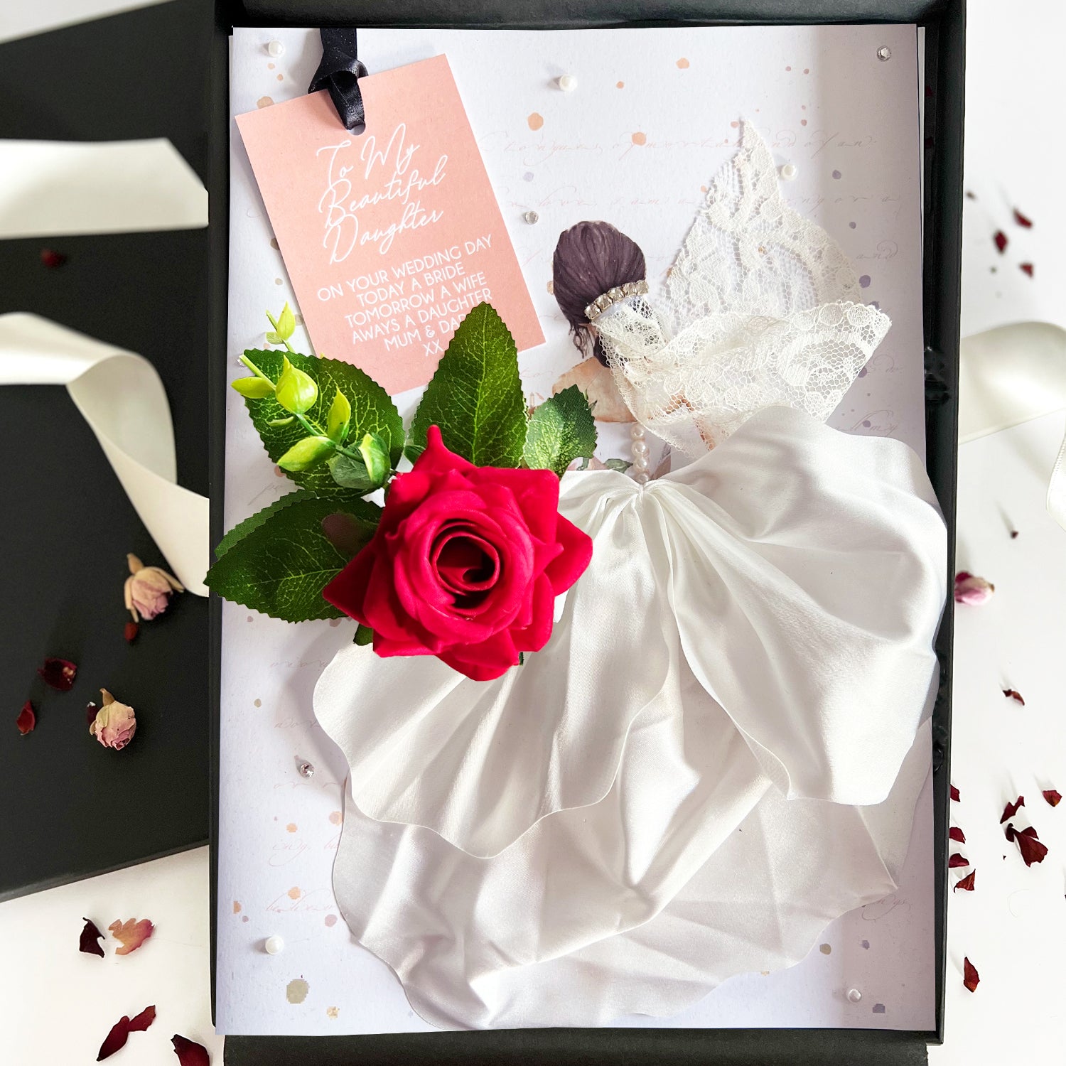 Each handmade personalised wedding card is unique to each order. A beautiful water colour bride print, where you can choose the brides hair colour - with Corinthians verse script in the background and then beautifully embellished with silk dress, plumped to perfection, pearl buttons down the back of her dress, a hand loomed lace veil, complete with with diamante cluster (clusters will vary depending on stock) & the star of the show our beautiful handmade velvet everlasting rose (You choose the colour), to symbolise everlasting love, scented with rose as her bouquet. A simply beautiful card from grandparents on Granddaughters special day.