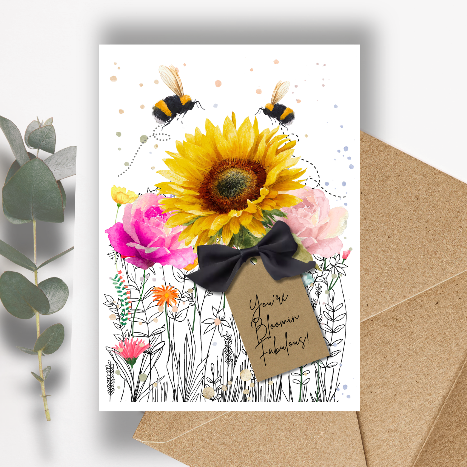 Card Reads 'You're Bloomin Fabulous!' With our artist painted watercolor wildflower & sunflower blooms in vase prints painted by Lily and made into cards that can be experienced. Beautiful greetings cards for Mothers Day | Birthday | Engagement | Anniversary | Wedding