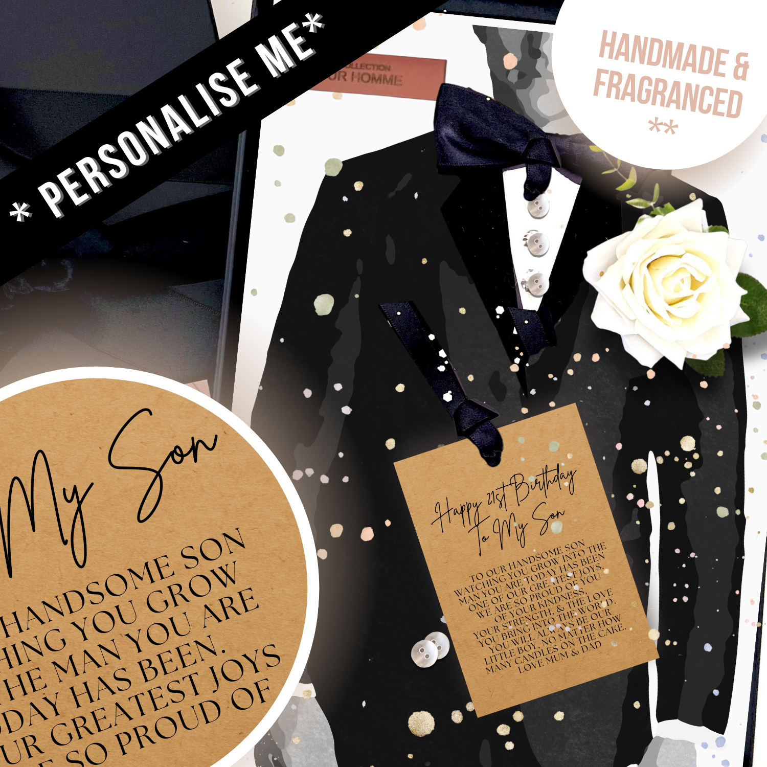 The Tux Card is the new and eagerly anticipated Homme Collection: 21st Birthday Cards for him . 21st Son, Grandson, 16th Nephew cards where you personalise the message and colours. This Man in Tux card is the perfect personalised card for him on his special birthday. Each tux birthday card is printed with watercolour painted man in tux, handmade with luxury embellishments including real freshwater pearl buttons down the shirt, velvet jacket collar, super silky satin bow tie in your colour choice for special age birthdays, events.