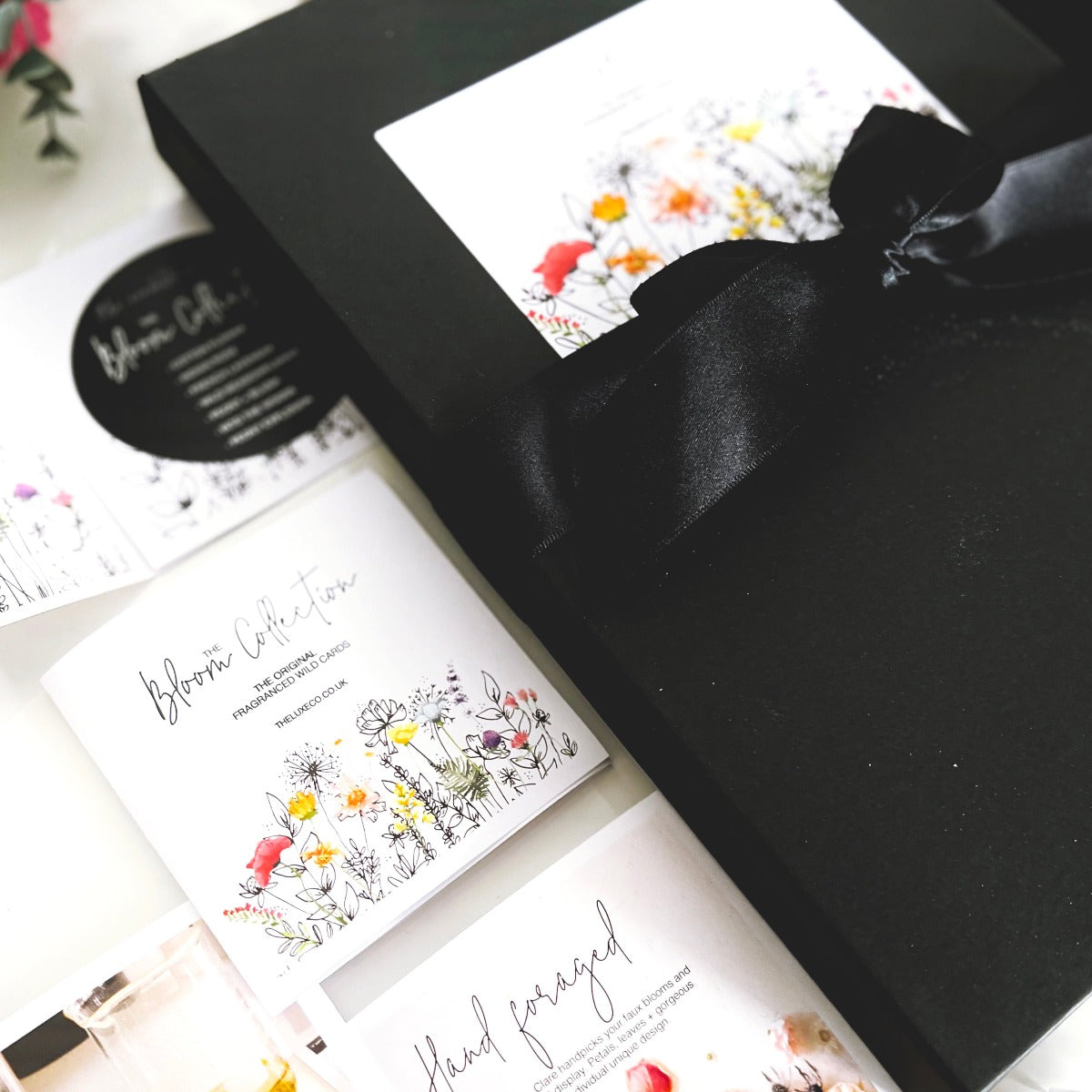 Bloom cards are boxed in black boxes to match their branding and tied with a big fat bow.