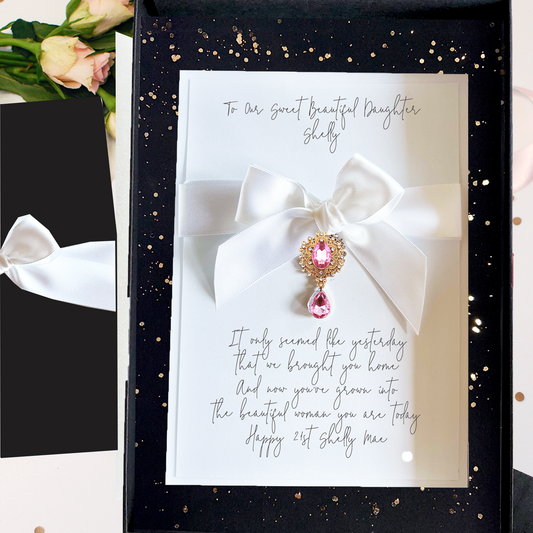 A lot of thought goes into our handmade cards. It's the attention to detail that makes a gift out of opening. Our luxury personalised handmade cards have been designed to be a treat to open. Housed in luxury gift boxes, designed with silky ribbon bow ties to wrap around boxes (pre-tied, for you to slip over the box before giving). We want to make a real treat out of opening one of our cards. Like a gift.