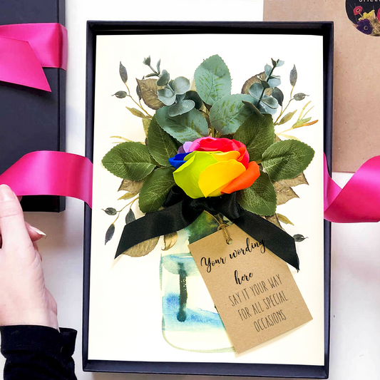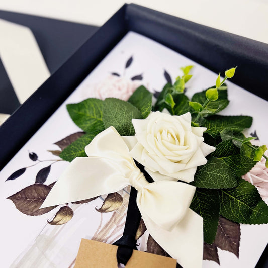 A lot of thought goes into our handmade cards. It's the attention to detail that makes a gift out of opening. Our luxury personalised handmade cards have been designed to be a treat to open. Housed in luxury gift boxes, designed with silky ribbon bow ties to wrap around boxes (pre-tied, for you to slip over the box before giving). We want to make a real treat out of opening one of our cards. Like a gift.