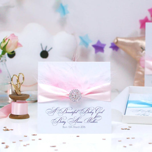 Baby Girl Fluffy Feather Personalised Baby Card