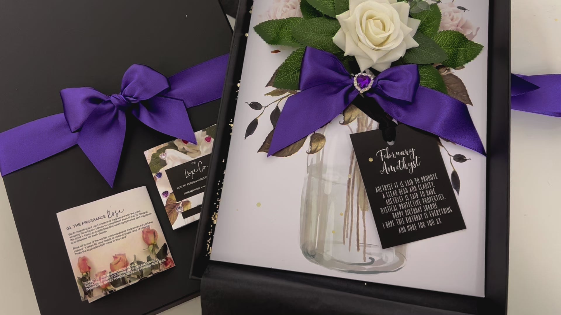 A card and gift in one. Beautiful scented cards available to personalise with your own crystal birthstone heart in the birthstone for each months Birthday (read below for characteristics of each stone). Our intricate handmade velvet everlasting blooms to symbolise everlasting love + beauty. Roses are made to look real but last forever.
