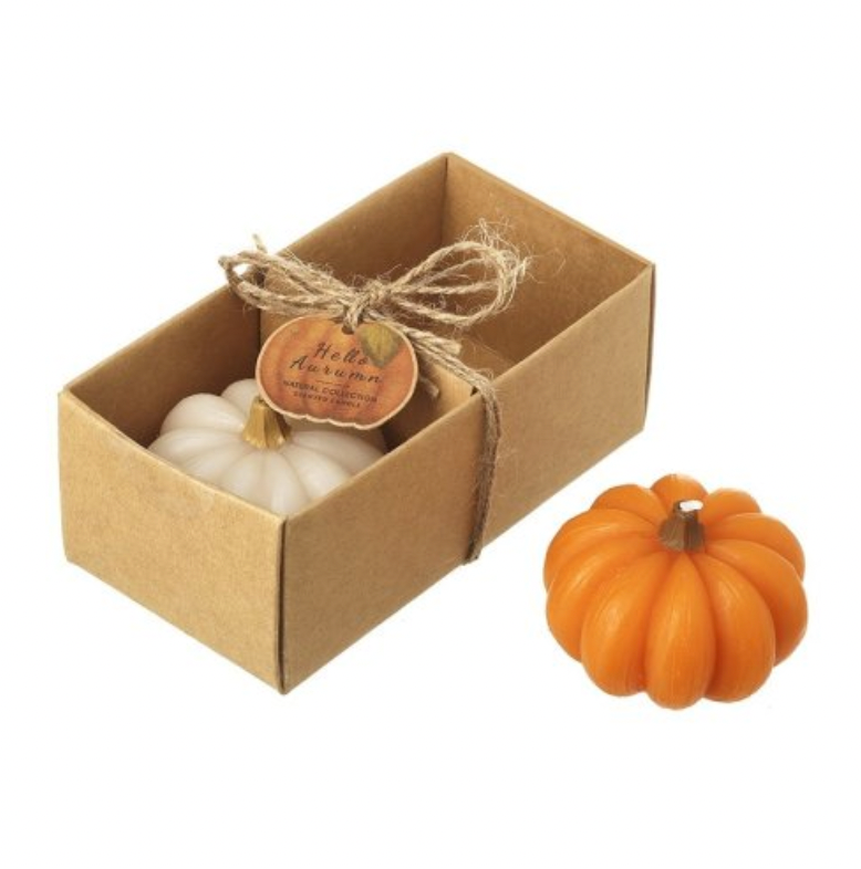 Perfect for the autumn season. This set includes two pumpkin shaped candles, beautifully presented in cardboard packaging and tied with rustic jute twine.