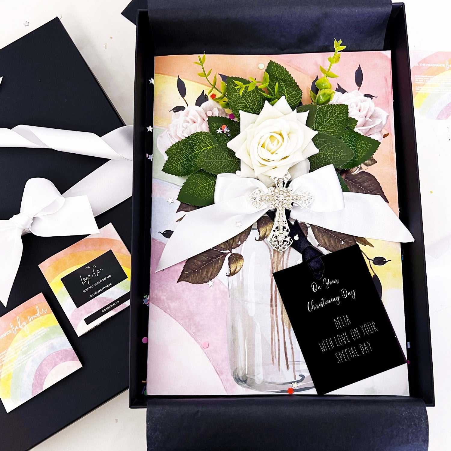 Comes with a tissue lined luxe gift box instead of an envelope and matching satin box bow to slot over the box before giving. With a sprinkling of confetti.