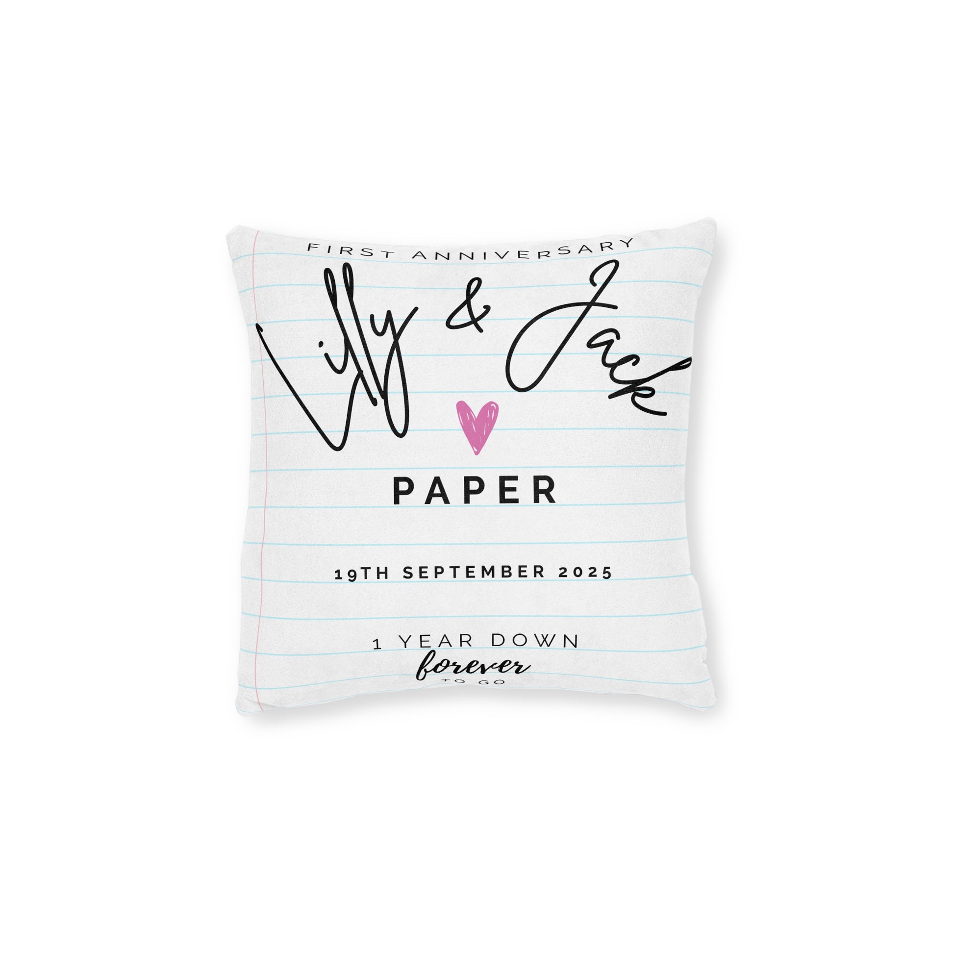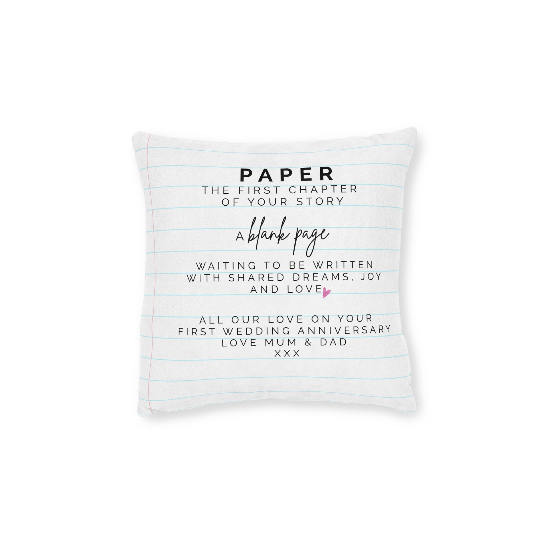 This Personalised Cushion makes a unique personalised 1st wedding anniversary gift for the 1st anniversary of paper. Featuring notebook style paper print to outer, with double sided personalised printing if desired.