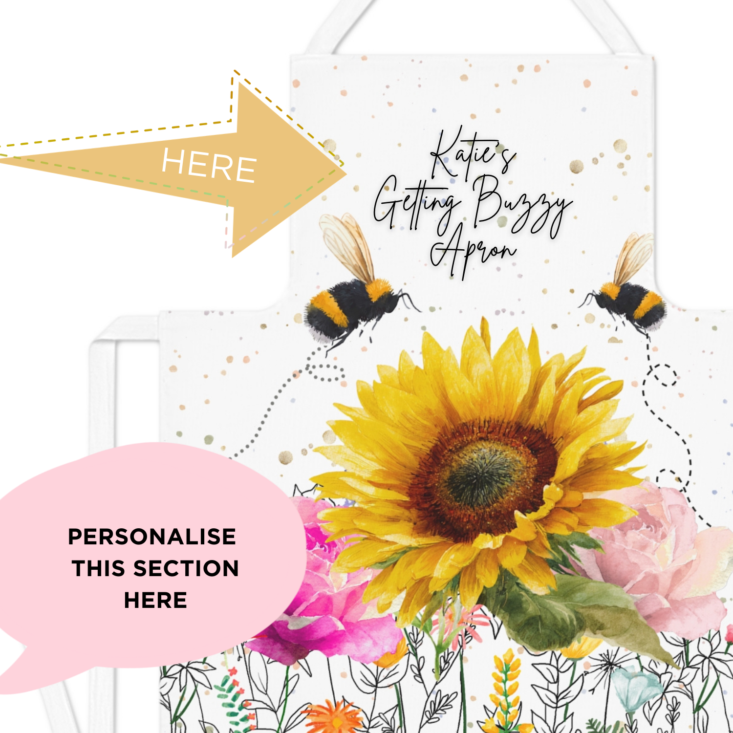 The Wildflower Apron comes Personalized with your own wording. Makes the perfect gift that will brighten a loved ones day. The design features our watercolour painted sunflowers and buzzy bee bloom design. Sunflowers symbolise happiness, joy and friendship and and are often given for joyous celebrations such as births, birthdays, weddings and anniversaries. Sunflower lovers will adore this printed apron.