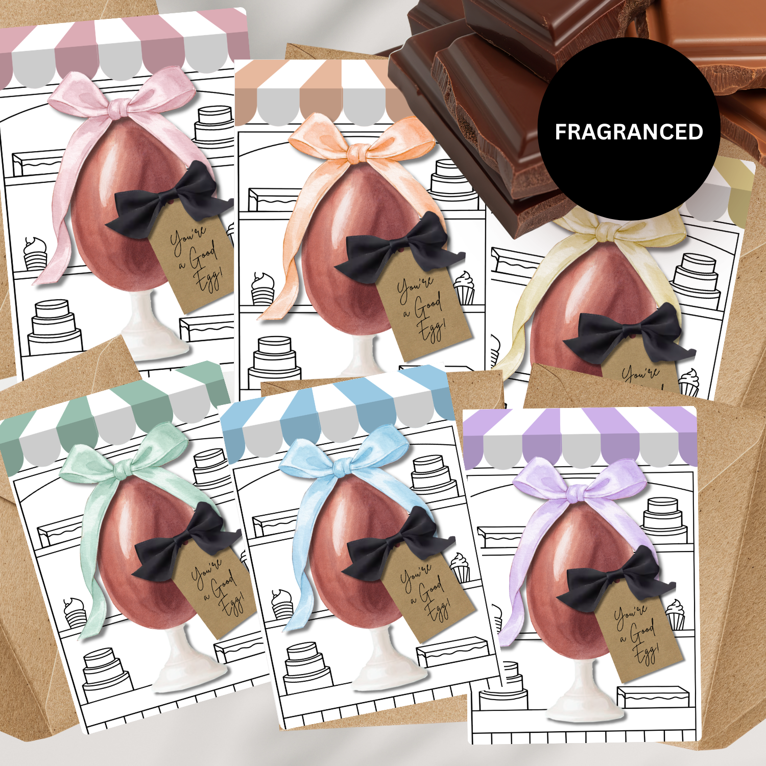 Wish all you know an egg-cellent Easter with our deliciously chocolatey scented Easter Cards - A pack of 6 pastel Easter cards Scented luxury Easter Cards with a 3d satin bow. Delicately fragranced with our amazing gooey chocolate fragrance - a sweet coco with zero calorioes that wafts out of the envelope when the recipient opens it. That smells good enough to eat - So good it comes with a warning - DO NOT EAT THESE CARDS!