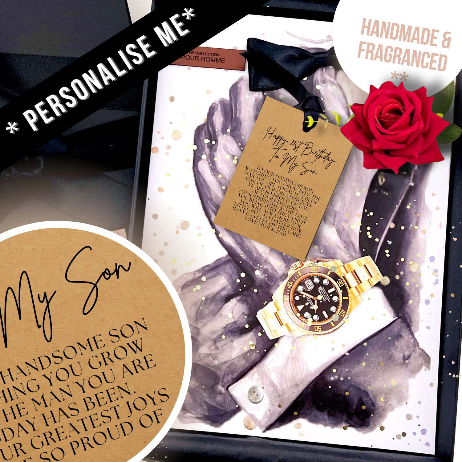 Each card is printed with watercolour painted man in suit, handmade with luxury 3d embellishments that make the card pop. Including a leather signature Pour Homme tag, freshwater pearl button, velvet trims, super silky satin bow tie. With a handmade velvet rose added to the lapel of his jacket that is scented with our antique cologne fragrance and a rose that lasts forever - to symbolise your everlasting love for that special guy.